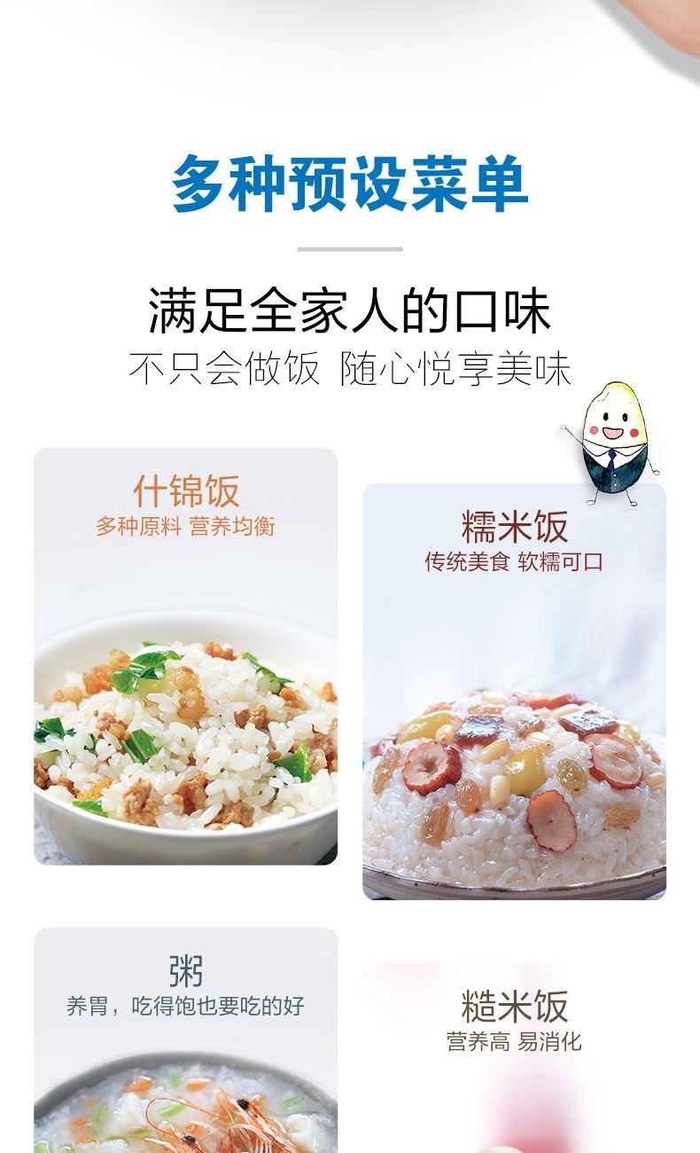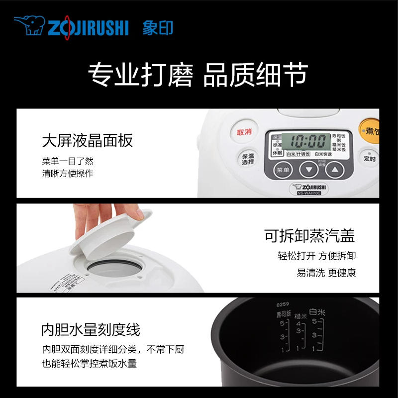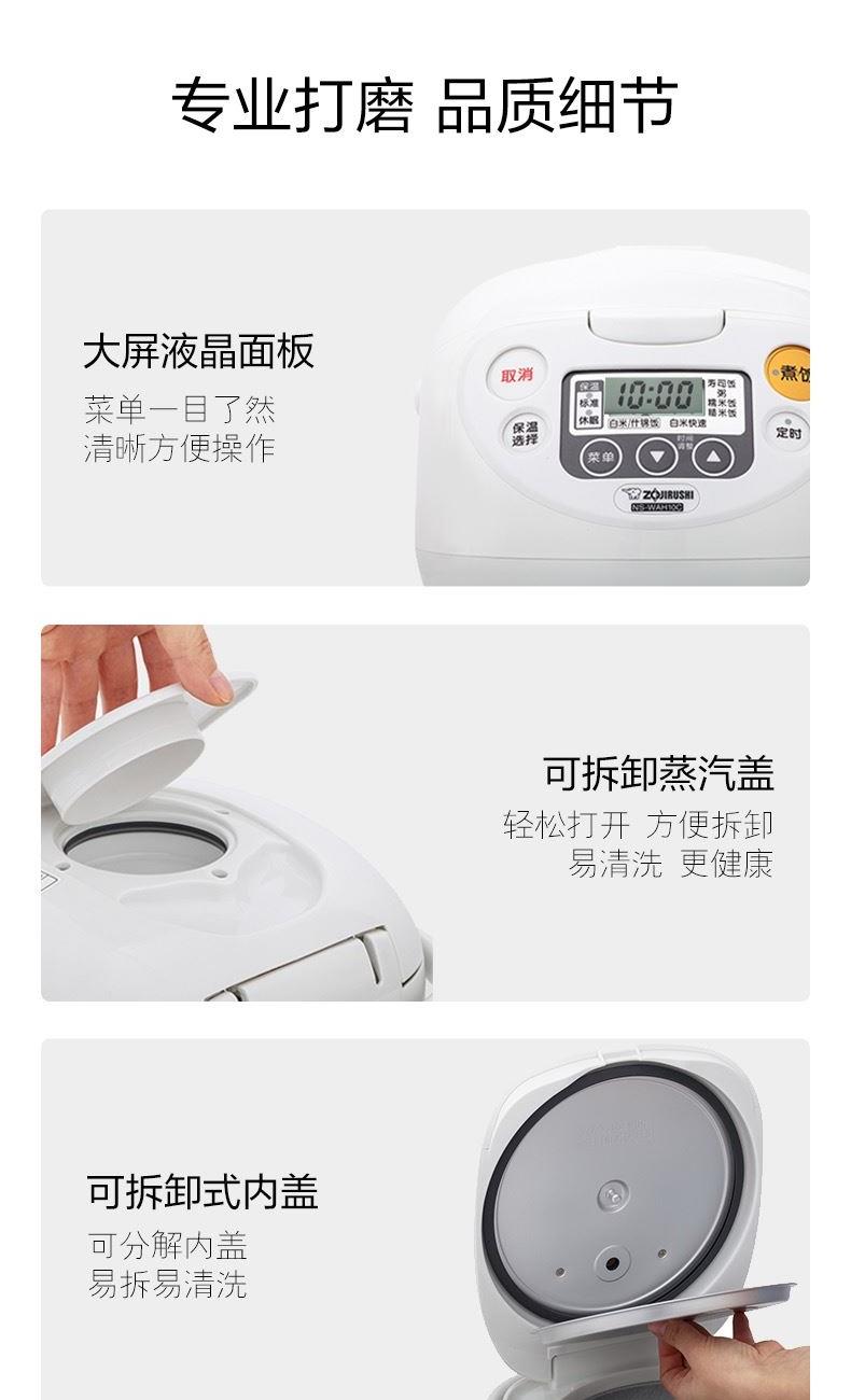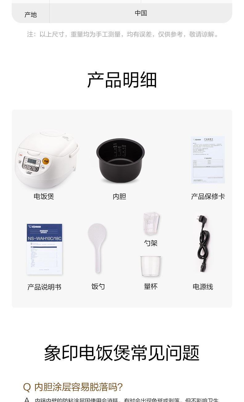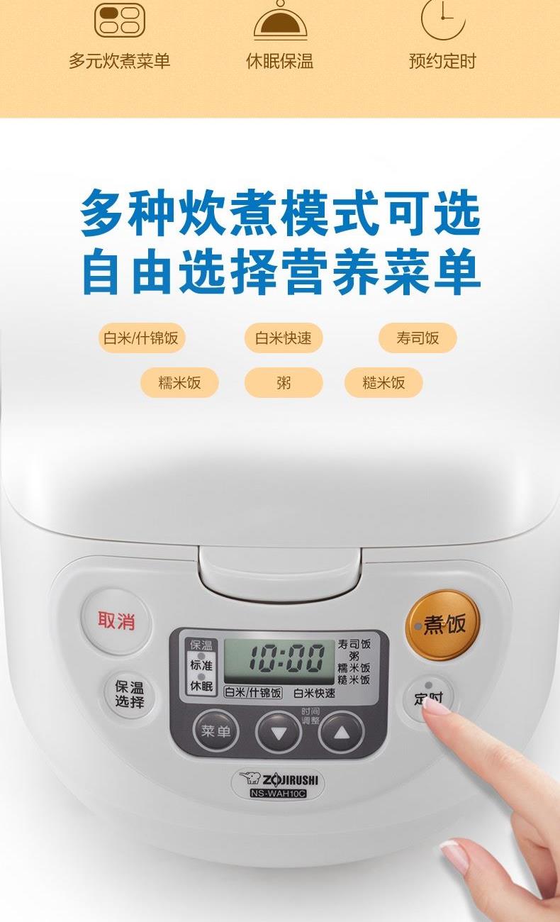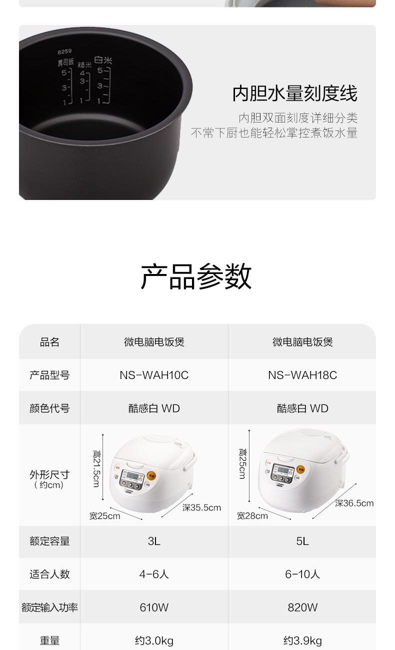 型號(hào):NS-WAH18C 顏色:白色 容量:5L 額定輸入功率:820W 重量:約3.9kg 產(chǎn)地:中國(guó) 煮飯方式:直接加熱 煮飯種類:白米、什錦飯、白米快速、壽司飯、糯米飯、粥、糙米飯、發(fā)芽米 產(chǎn)品特點(diǎn): 超大面板\可拆洗內(nèi)蓋\全面加熱 音樂(lè)告知\內(nèi)鍋可洗米 易清洗蒸汽口\休眠保溫 白米快速煮飯\預(yù)約煮飯 2組時(shí)間記憶定時(shí)