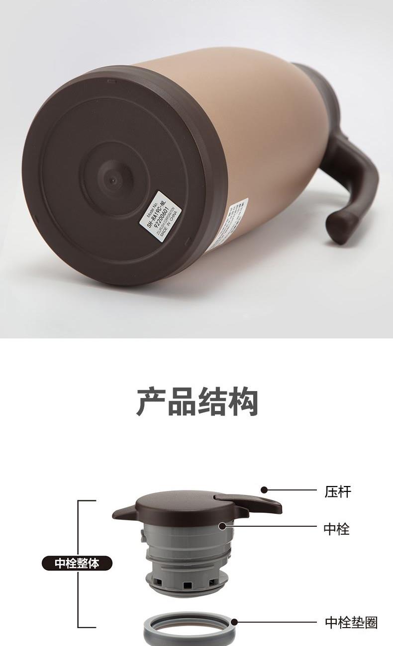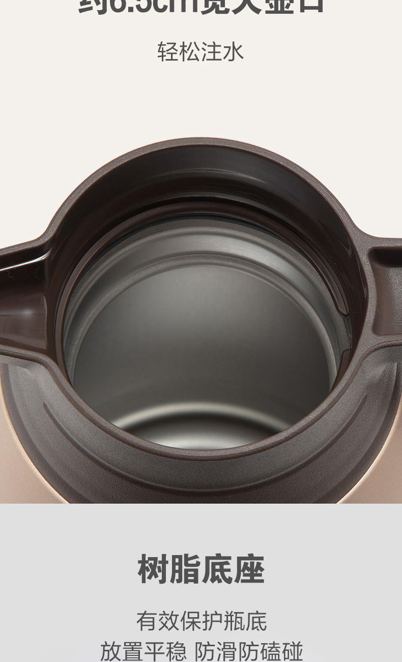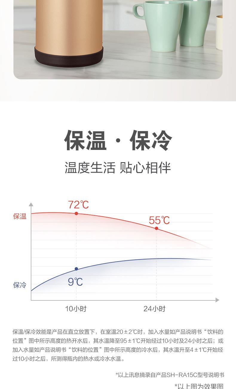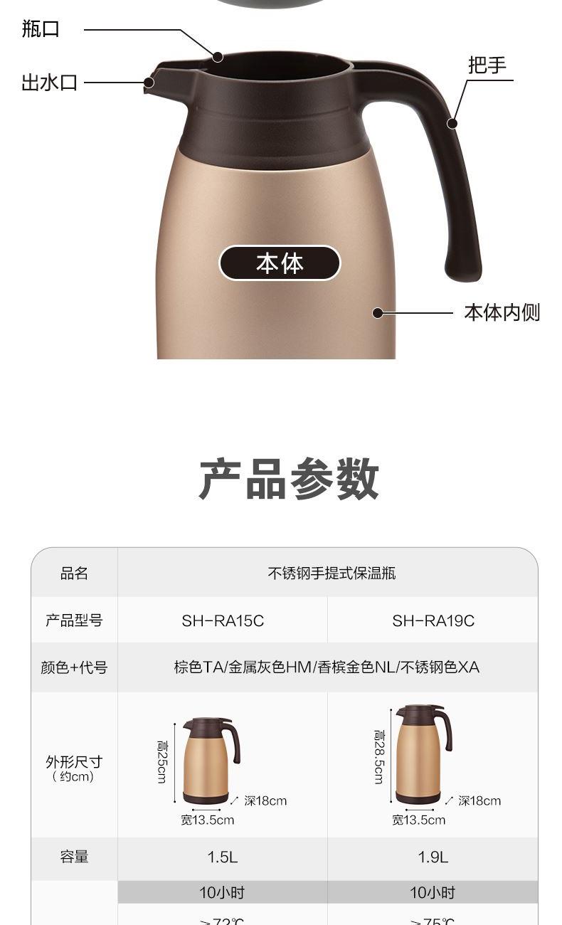 型號:SH-RA15C 顏色:金屬灰色HM,棕色TA,香檳金色NL 容量:1.5L 材質(zhì):304不銹鋼 開蓋方式:旋轉(zhuǎn)開蓋 保溫效率:10小時≥72℃,24小時≥55℃ 保冷效率:10小時≤9℃ 外形尺寸(寬深高):13.5x18x25cm 重量:0.8kg 產(chǎn)地:中國浙江 產(chǎn)品特點: 樹脂底座、寬口徑、SU304不銹鋼、滴落式給水、大容量1.5L