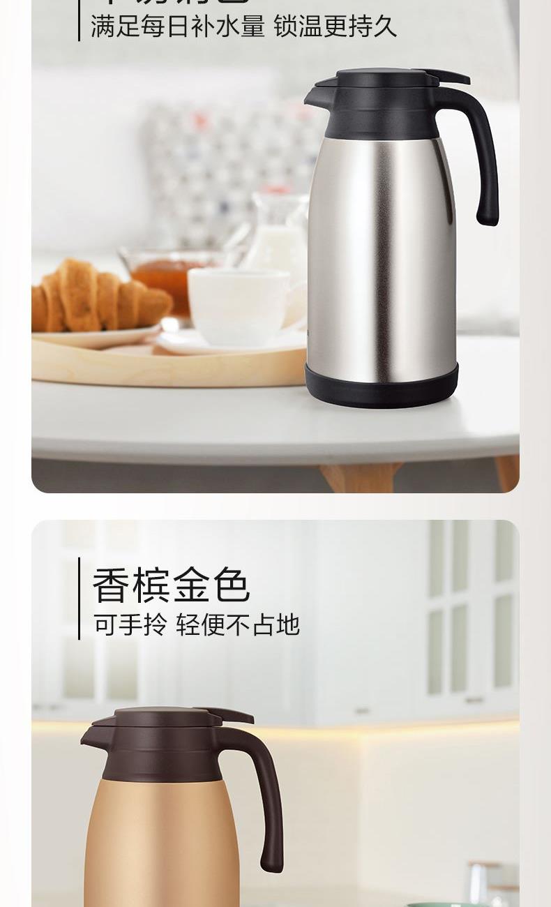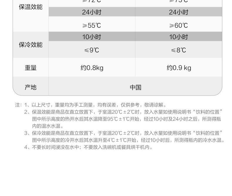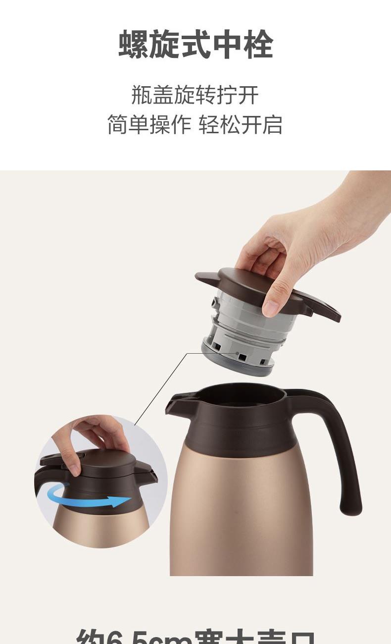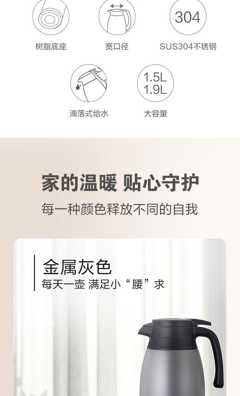 型號:SH-RA15C 顏色:金屬灰色HM,棕色TA,香檳金色NL 容量:1.5L 材質(zhì):304不銹鋼 開蓋方式:旋轉(zhuǎn)開蓋 保溫效率:10小時≥72℃,24小時≥55℃ 保冷效率:10小時≤9℃ 外形尺寸(寬深高):13.5x18x25cm 重量:0.8kg 產(chǎn)地:中國浙江 產(chǎn)品特點: 樹脂底座、寬口徑、SU304不銹鋼、滴落式給水、大容量1.5L