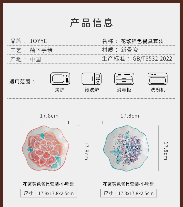 產品尺寸:飯碗*4:13x13x6.5cm 菜盤 *4:21.6x21.6x3.8cm