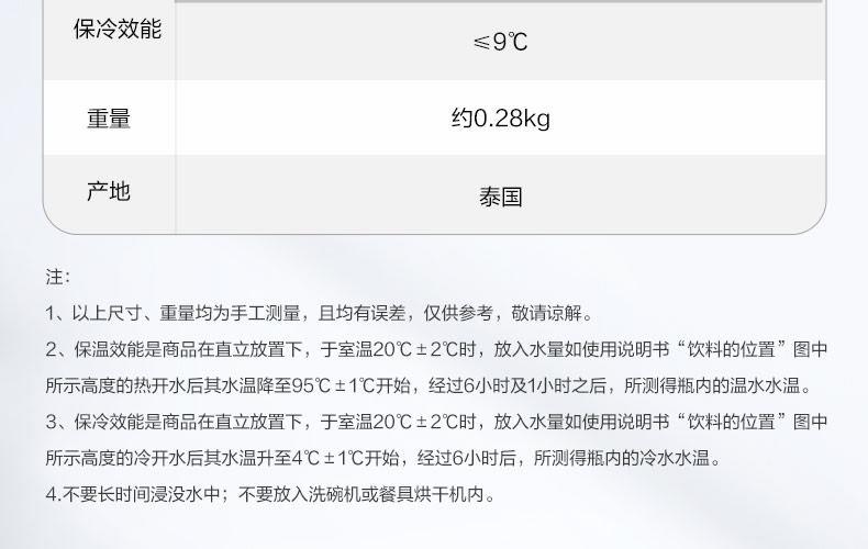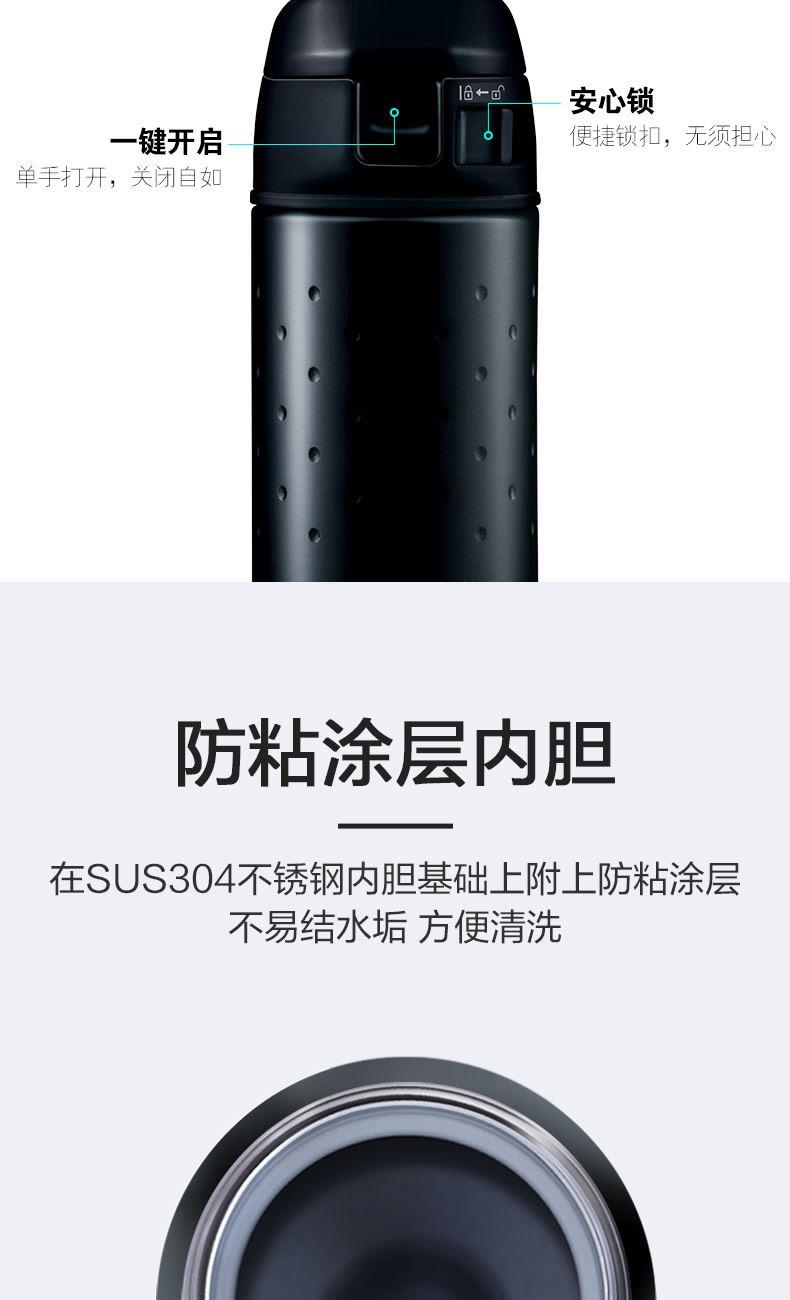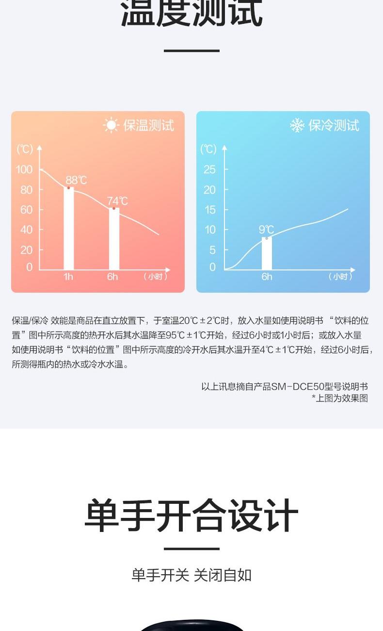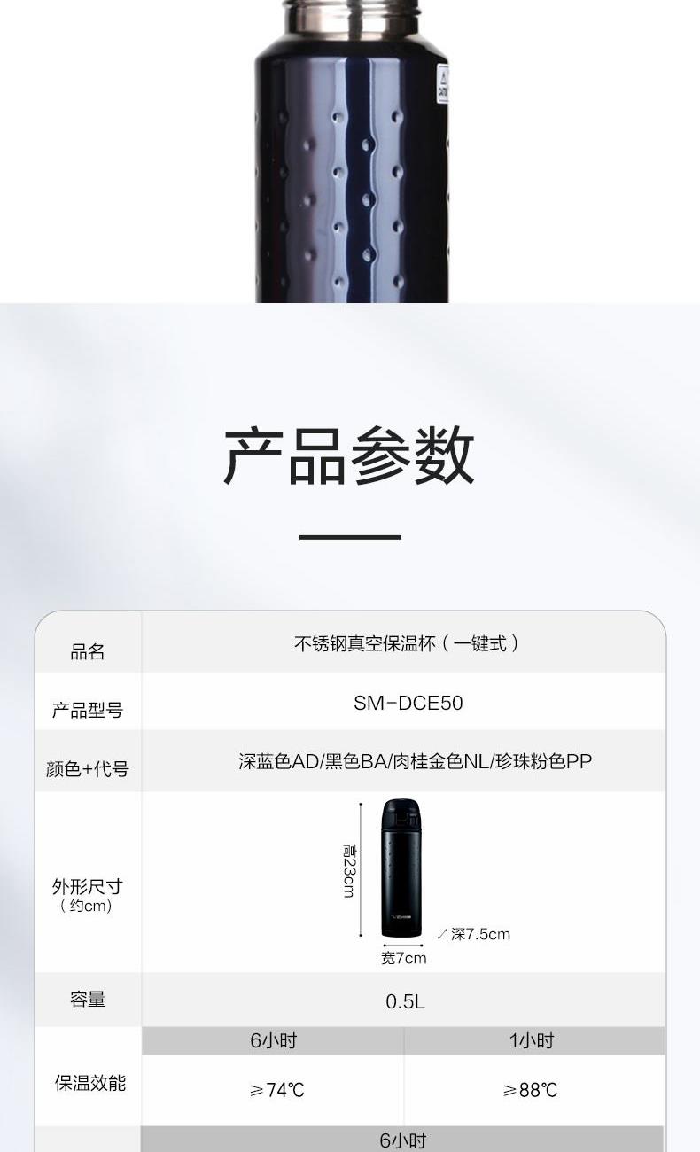 產品型號:SM-DCE50 顏色:深藍色AD/黑色BA/肉桂金色NL/珍珠粉色PP 容量:500ml 款式:一鍵式彈蓋 涂層:含防粘涂層 本體內側/外側 外形尺寸(寬深高):7x7.5x23cm 保溫能效:6小時≥74℃,1小時≥88℃ 保冷能效:6小時≤9℃ 重量:約0.28kg 產地:泰國 單手開合設計,一鍵開啟,關閉自如 保溫保冷設計,鎖溫保冷,四季相伴 防粘涂層內膽,不易結水垢,方便清洗 外出使用后均可整體清洗,使用更舒心