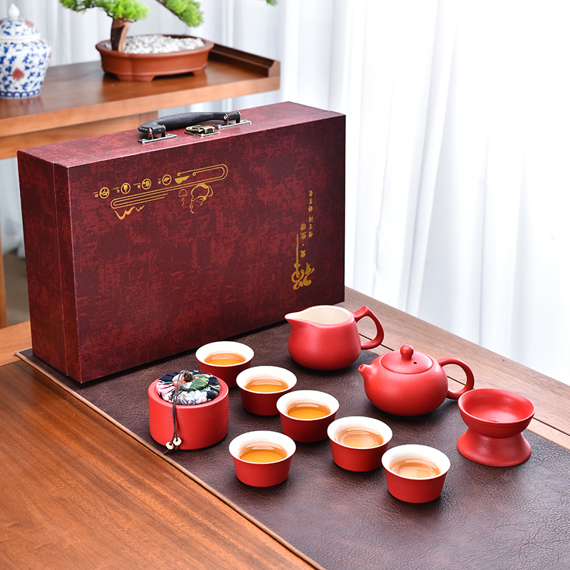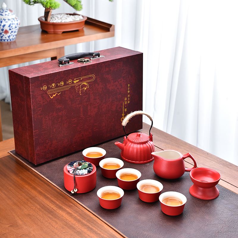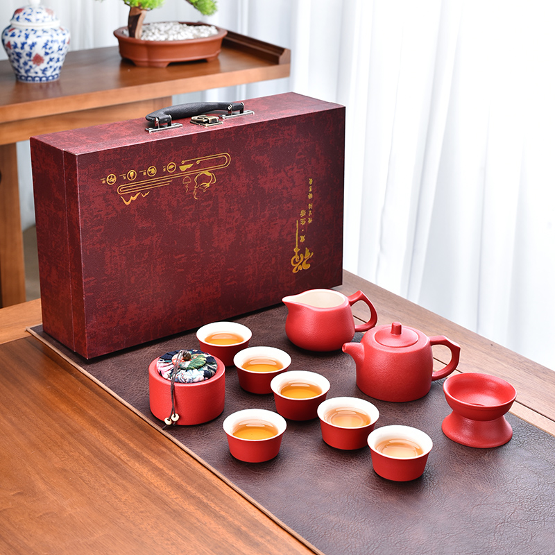 配制:1壺 6杯 1茶葉罐 1公道杯1茶托茶漏 1禮盒 材質(zhì):粗陶 規(guī)格: 茶壺:11.7*9.5cm 杯: 6.3*3.3cm 茶葉罐: 8*7cm 公道杯:11.9*8.5cm 推薦說明:開門紅商務(wù)套裝。亞光磨砂釉茶具,手感舒適。11頭一應(yīng)俱全,大氣實(shí)用。可激光雕刻定制。